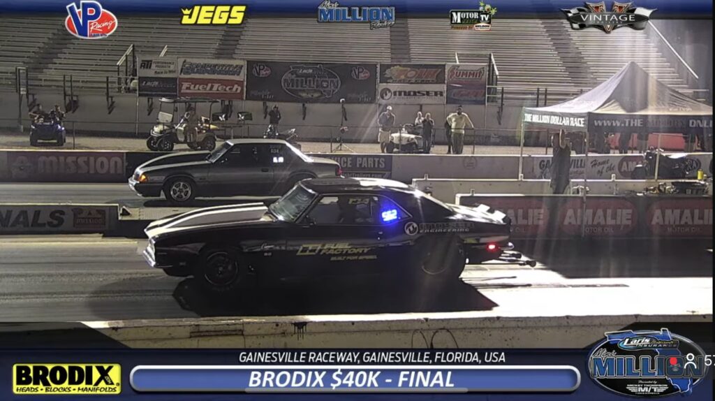 Saturday at the Folk Promotions Mini Million in Gainesville, FL produced an all-Door Car Final Round in the $40K-to-win Main Event. The Fox-body Mustang of Brendan George laid down a nearly perfect .002 package to defeat Jason Lynch’s Fuel Factory Camaro for the day’s top prize. The Mini Million’s final $40K Main event will take place on Sunday. To follow along with the Mini Million, head on over to MotorManiaTV on Youtube for Live Stream coverage.