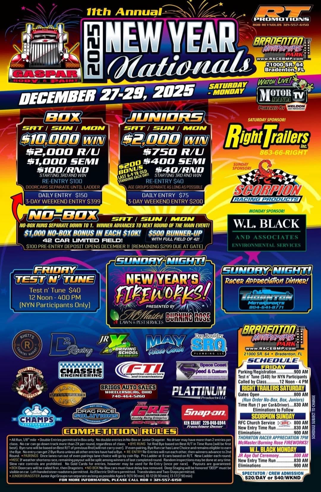 The final day of the FTD Customs 5-Day Bracket Race at Immokalee Regional Raceway in Immokalee, FL was a Dragster dominated afternoon with Ryan Barnes turning on the final round win light for $40K. Barnes got the win in an all-Dragster final round when Bode Bennett turned it .002 Red in the other lane. More dragsters were semi-finalists with Cooper Chun and Talon Farmer earning those checks on the day. To look back at any of the action from this event, go to MotormaniaTV on Youtube Live Stream. Many of these racers will be back at it on Tuesday for the start of Winterfest 2025 at Immokalee Regional Raceway.