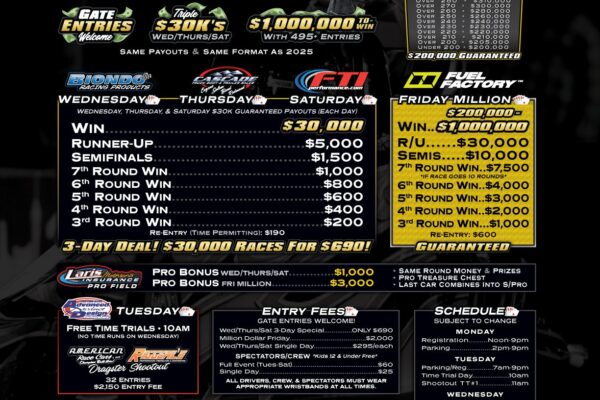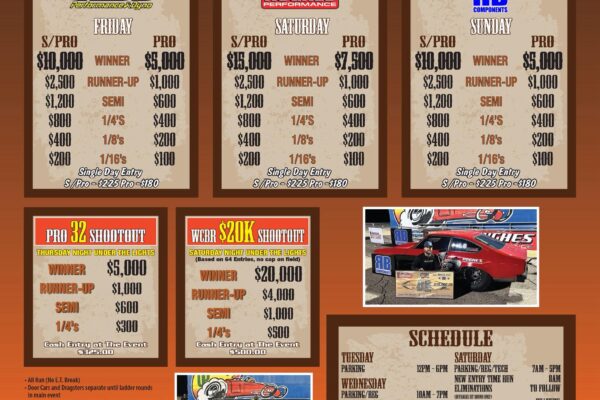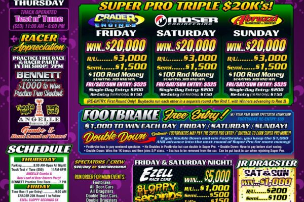 Saturday/Sunday RecapFlicker Promotions’ Southern Big Buck Nationals is in the books after a great weekend of racing at Montgomery International Dragway in Montgomery, AL. Saturday’s $20K Main Event came down to local racer Hunter Whitehead in his Camaro and Jake Clayton wheeling one of the Overkill Motorsports Dragsters. Whitehead laid down 8 total (.006, dead…